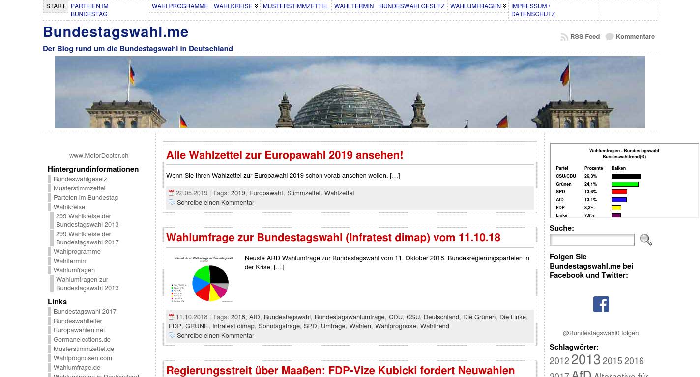 | Description | Alles zu Bundestagswahlen, Landtagswahlen und Europawahlen: Termine ✓ Wahlkalender ✓ Parteien ✓ Kandidaten ✓ Koalitionen ✓ Wahlprogramme ✓ Diagramme ✓ Aktuelles ✓ Kommentare ✓ Bundestagswahl 2021 ✓ |