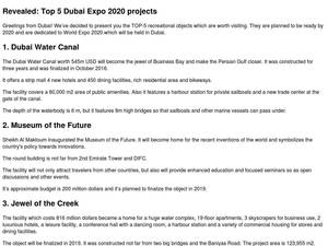 | Description | Expo 2020 Dubai will host the world for 182 days, each one brimming with new experiences. It'll be a time to create, collaborate and innovate. |