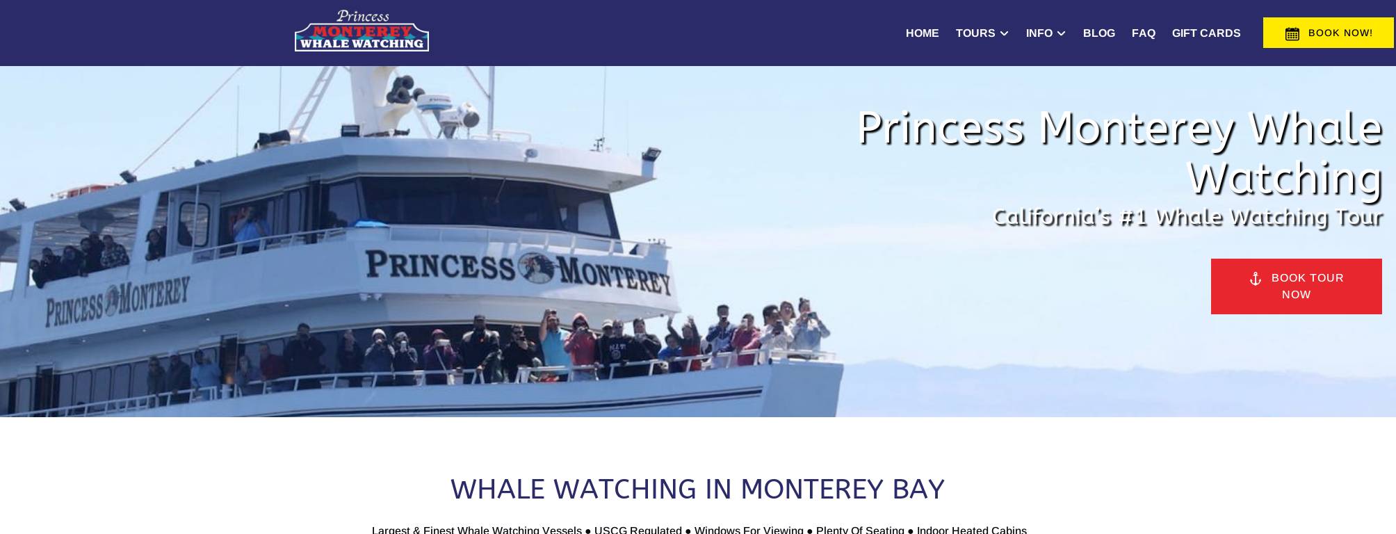 | Description | Explore the beautiful Monterey Bay National Marine Sanctuary on our whale watching tour! See humpbacks, orcas, blue whales, and dolphins! Book your tour today! |