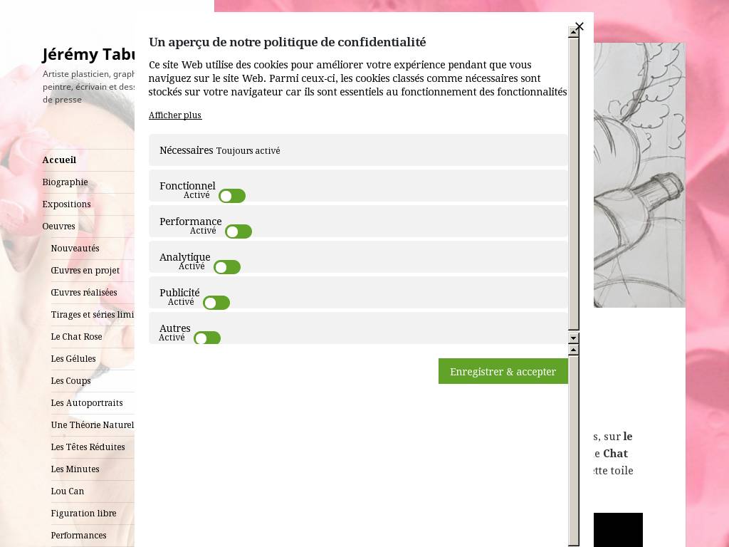 | Description | Découvrez sur ce site les œuvres de l'artiste Jérémy Taburchi, notamment les tableaux, peintures et sculptures de son Chat Rose, ainsi que d'autres styles. |