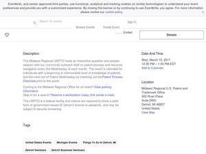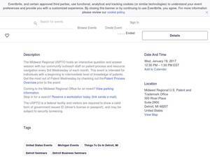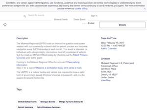 | Keywords | Eventbrite, Patent Wednesday at the Midwest Regional USPTO, Patent Wednesday at the Midwest Regional USPTO tickets, Patent Wednesday at the Midwest Regional USPTO Detroit, Patent Wednesday at the Midwest Regional USPTO Detroit tickets |