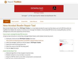 | Description | Adobe Acrobat Repair Tool for repairing incorrect PDF documents. PDF Repair Toolbox helps fix PDF documents of any version. |