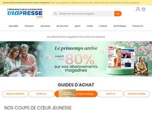 | Description | Toute la presse au numéro et tous vos magazines à l’abonnement, un choix de plus de 1 000 magazines avec des réductions jusqu’à -85%. Pour 2 abonnements achetés, 11€ de remise immédiate hors Titres Milan presse et Bayard presse. |