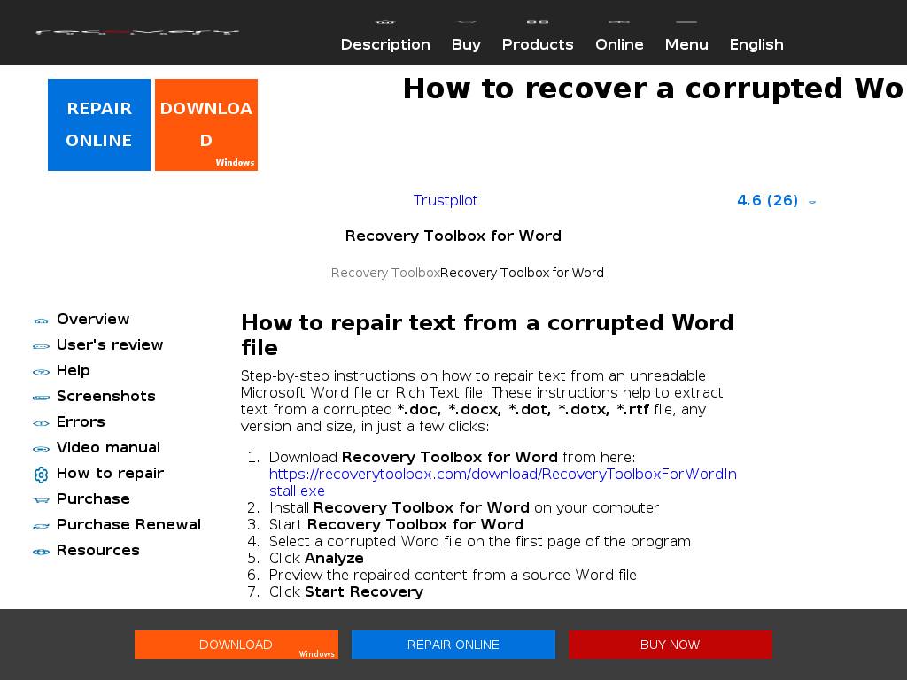| Description | How to repair corrupted Microsoft Word document? Recovery Toolbox for Word helps to repair corrupted damaged *.doc, *.docx, *.dot, *.dotx, *.rtf files easy. Word Repair Tool. DOCX Repair Tool. DOC Repair Tool. |